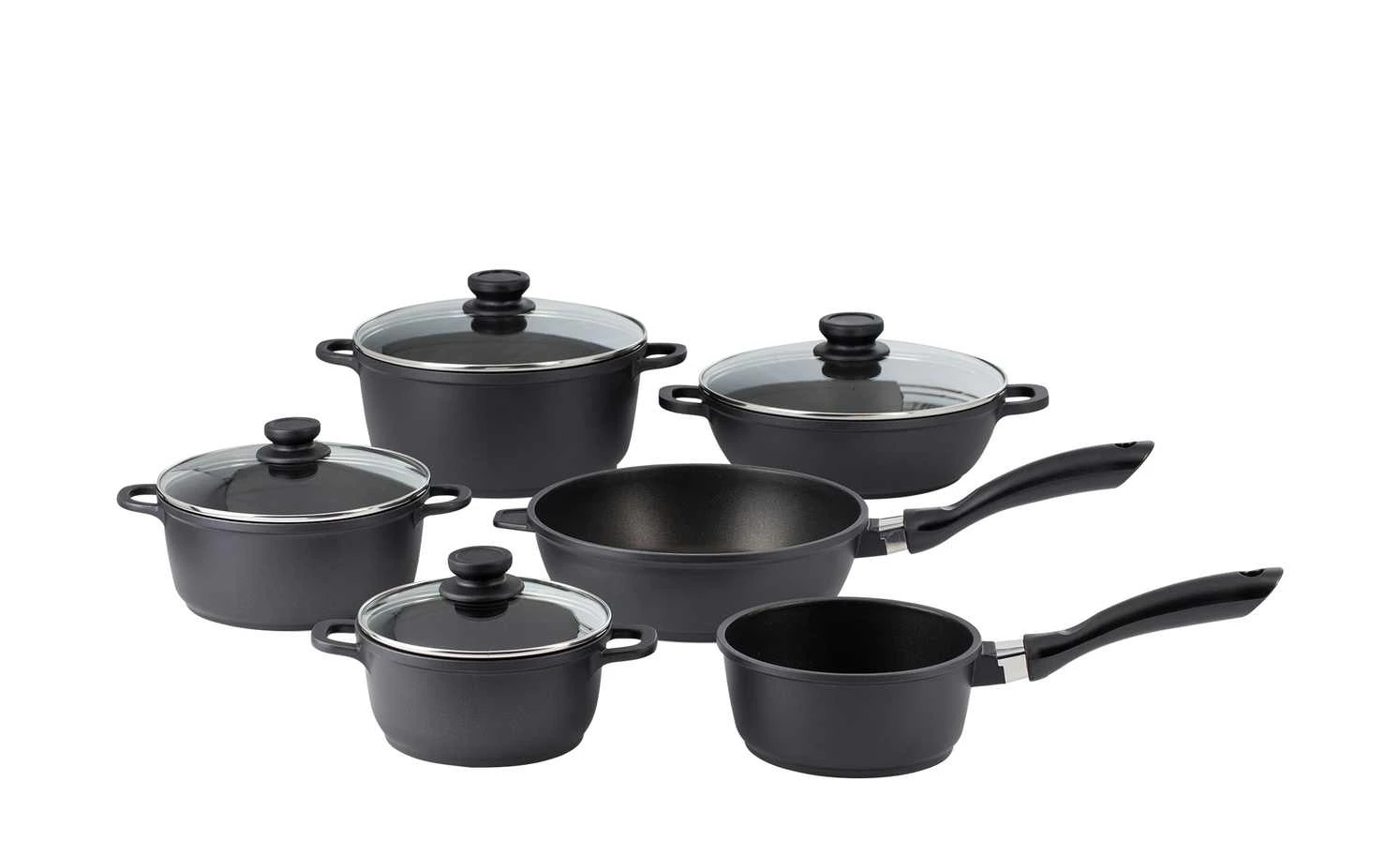 - Lieferumfang / mitgeliefertes Zubehör: 1x Stielkasserolle Ø 16 cm, 1x Servierpfanne Ø 24 cm mit Deckel, 1x Kochtopf Ø 16 cm mit Deckel, 1x Kochtopf Ø 24 cm mit Deckel, 1x Kochtopf Ø 20 cm mit Deckel, 1x Schmorpfanne Ø 24 cm