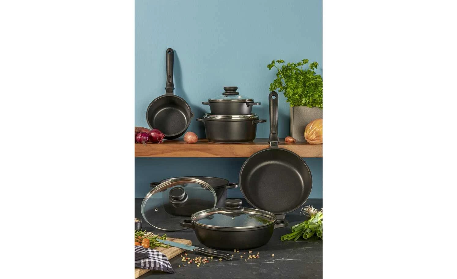 Dieses Set enthält alles, was eine Küche braucht. Die Stielkasserolle eignet sich hervorragend für Puddings und Saucen oder zum Aufwärmen kleinerer Speisereste. Die drei Kochtöpfe sind toll zum Kochen von Fleisch, Kartoffeln, Nudeln, Reis und Gemüse. In der Servierpfanne kann erst angebraten und gekocht werden, um danach direkt zu servieren. Die Schmorpfanne ist besonders für Schmorbraten geeignet. Anbraten, Flüssigkeit angießen und dann langsam schmoren für einen leckeren, saftigen Braten.