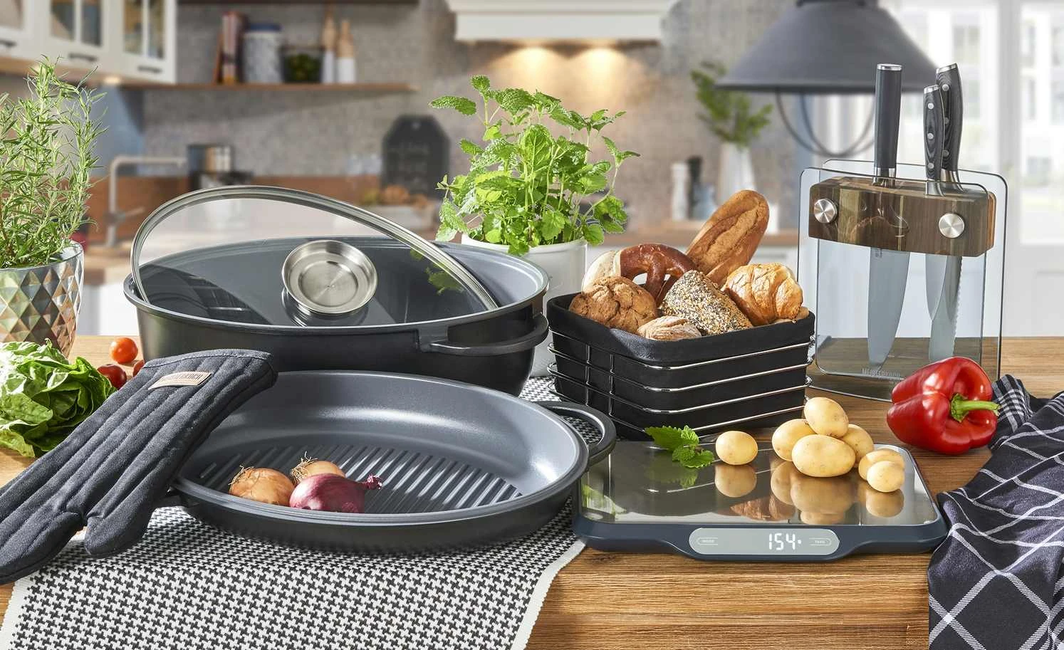 - Mehr zu Ausstattung / Funktion: Glasdeckel mit Aromaknopf , Aluguss-Pfanne kann statt des Glasdeckels als Bräterdeckel verwendet werden
