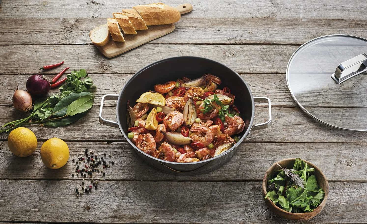 Die Servierpfanne stellt einen echten Hingucker in jeder Küche dar. Sie gibt die Möglichkeit, Mahlzeiten direkt vom Herd auf den Tisch zu servieren. Durch den hohen Rand lassen sich auch Eintöpfe und One- Pot- Gerichte prima darin zubereiten.